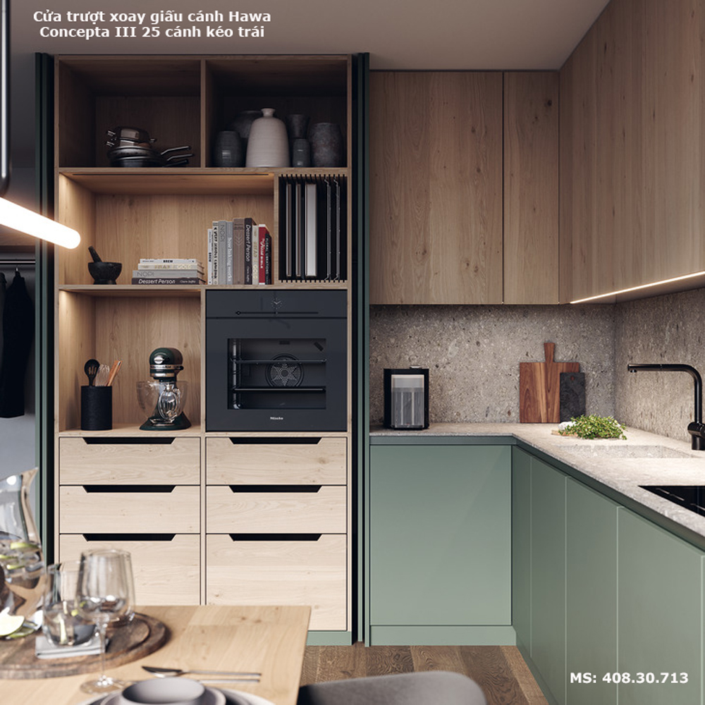 + Cửa trượt xoay giấu cánh Hawa concepta III cánh kéo trái 408.30.713 dùng lắp tủ trùm ngoài hoặc lọt lòng