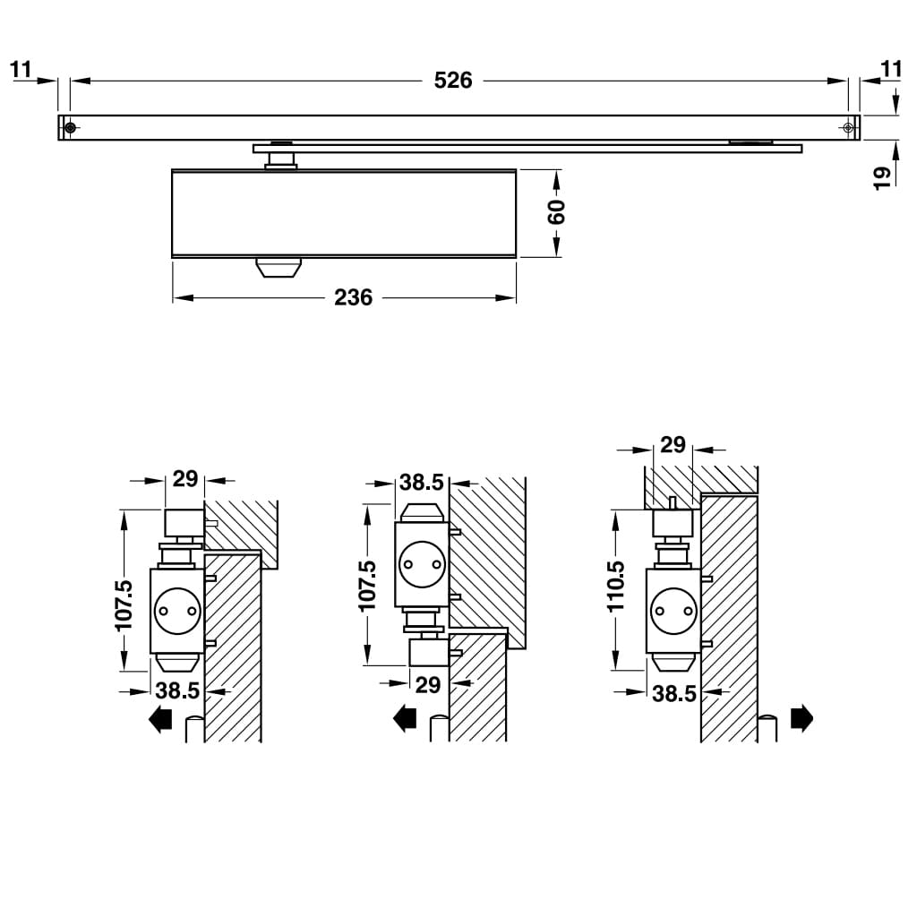 + Thiết bị đóng cửa tự động Hafele DCL21 931.84.129 thích hợp cho cửa mở trái và mở phải